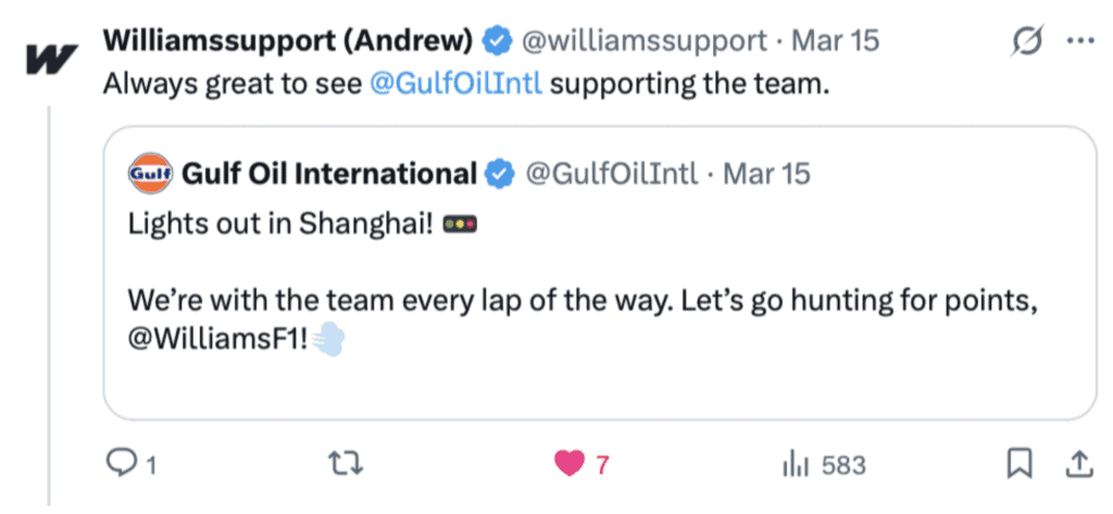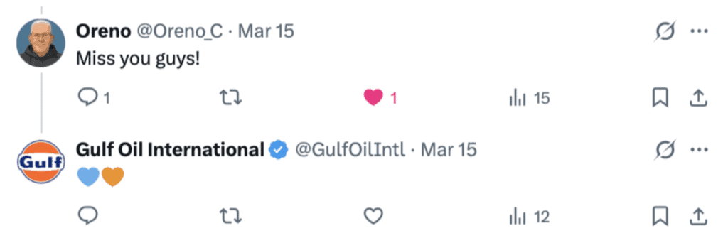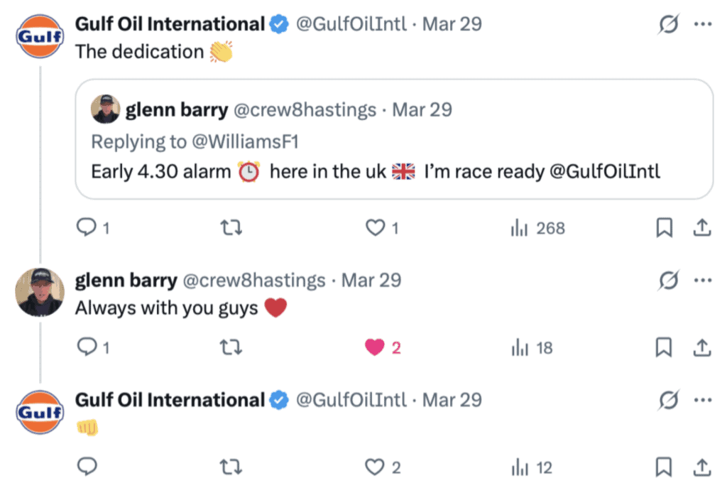 As an example, during Formula 1 race weekends, we actively manage Gulf’s community on X in real time, responding to fans as the action unfolds. When someone comments “Miss you guys!” or “Always with you ❤️,” they are looking for a seat at the table and we don’t leave it hanging, we reply, we engage, we bring them in.By responding with simple, human affirmations ,we validate their presence. This is how you “warm” a fan, turning a global corporation into a relatable entity within the safety of your owned channels.